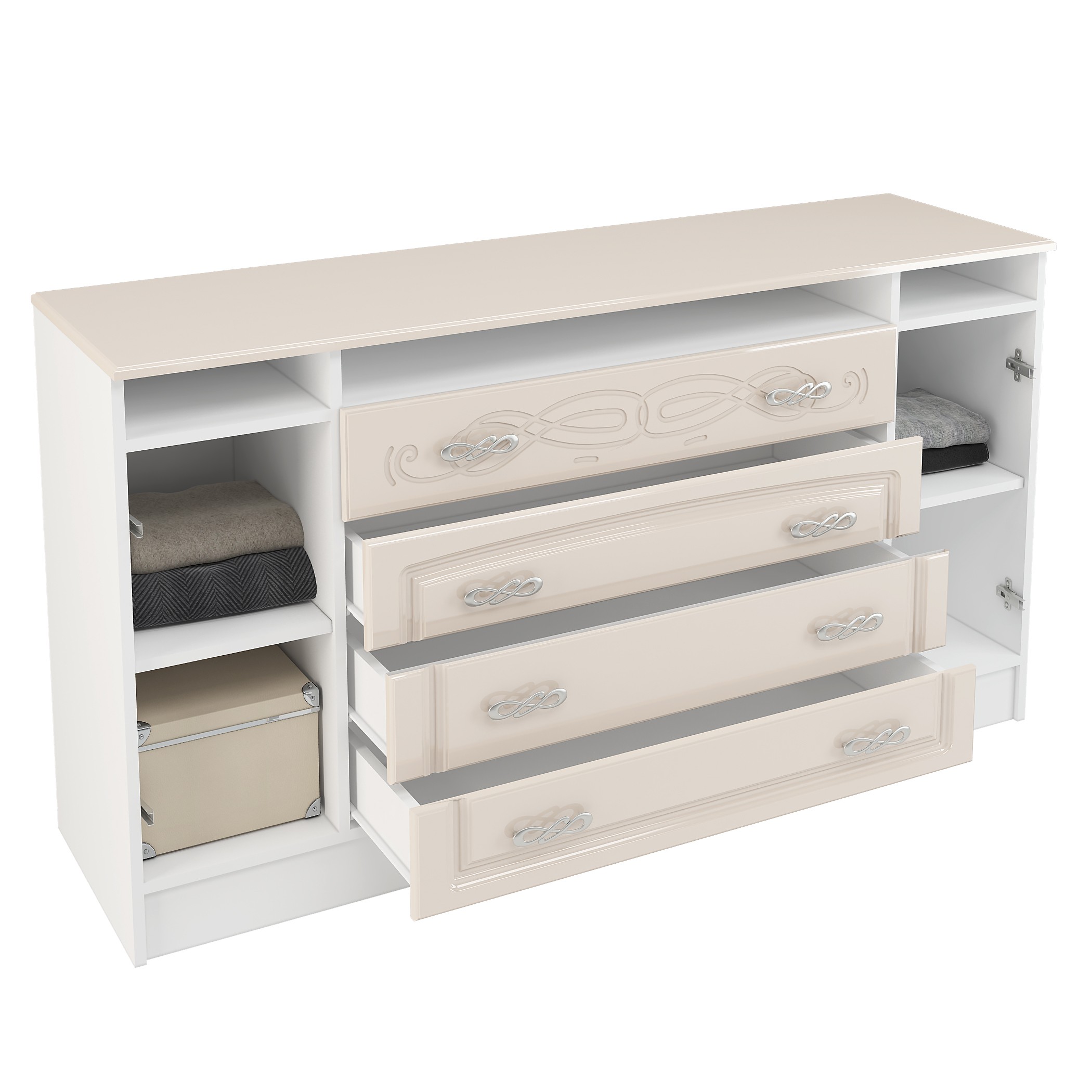 -Комод подойдет даже для небольшой спальни, при этом четыре объемных ящика вместят белье и другие предметы гардероба